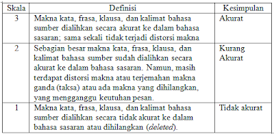 Terjemahan yang berkualitas adalah terjemahan yang memiliki tiga ciri, yaitu ketepatan, keterbacaan, dan keberterimaan. Penilaian tingkat keakuratan pengalihan pesan teks bahasa sumber ke dalam bahasa sasaran sebaiknya tidak dilakukan oleh hanya peneliti sendiri. Untuk menghasilkan penilaian yang lebih objektif, peneliti perlu melibatkan orang lain yang memiliki kompetensi (competence) dan keahlian (expertise) di bidang penerjemahan. Perlu dikemukakan di sini bahwa penilaian terhadap tingkat keakuratan pengalihan pesan akan selalu melibatkan teks bahasa sumber dan teks bahasa sasaran. Dengan kata lain, pembandingan antara pesan teks bahasa sumber dan pesan teks bahasa sasaran merupakan salah satu ciri penting dari penilaian tingkat keakuratan pengalihan pesan. Menurut Nababan (2003:62), ciri kualitas penerjemahan antara lain sebagai berikut: