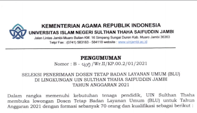 Dibuka Lowongan Dosen di Universitas Islam Negeri Sulthan Thaha Saifuddin Jambi sebanyak 70 orang anggaran tahun 2021.