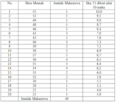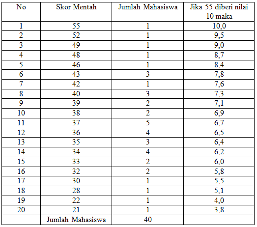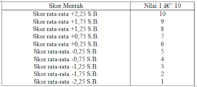 Dengan demikian dapat dibuat tabel konversi skor mentah ke dalam nilai 1-10.